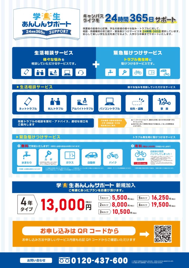 24時間365日対応「学生あんしんサポート」の加入受付を開始しました!